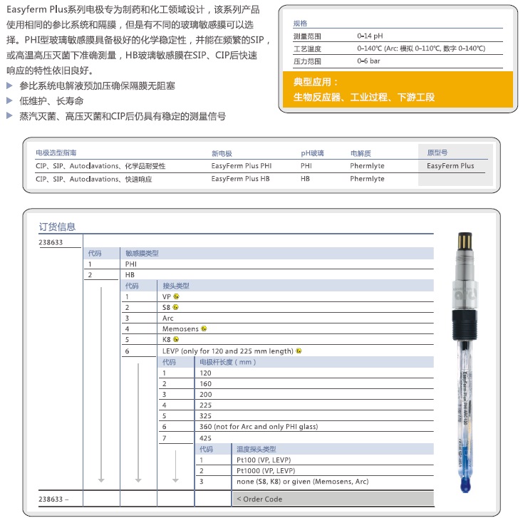 Easyferm Plus系列電極專為制藥和化工領域設計,,該系列產品使用相同的參比系統(tǒng)和隔膜,,但是有不同的玻璃敏感膜可以選擇。PHI型玻璃敏感膜具備極好的化學穩(wěn)定性,,并能在頻繁的SIP,,或高溫高壓滅菌下準確測量,,HB玻璃敏感膜在SIP、CIP后快速響應的特性依舊良好。